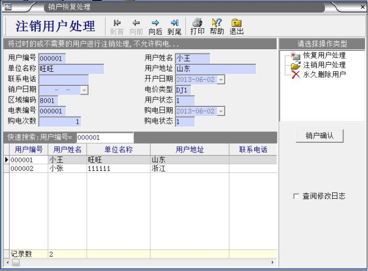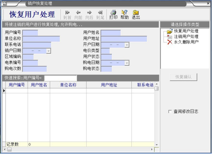 ,鼠標(biāo)左鍵“銷(xiāo)戶恢復(fù)處理”,出現(xiàn)以下對(duì)話框: