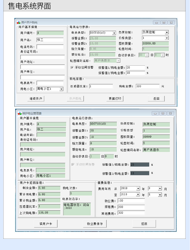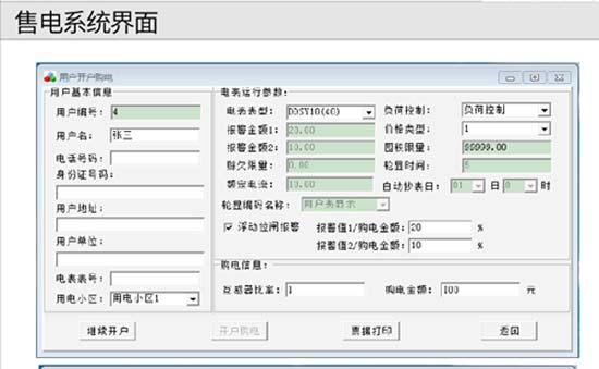 7、購電方式:售電時,將IC卡插入IC卡讀寫器,同時操作計算機,將用戶編號、預購電量、報警電量、限容方式及限容功率等加密寫入IC卡。