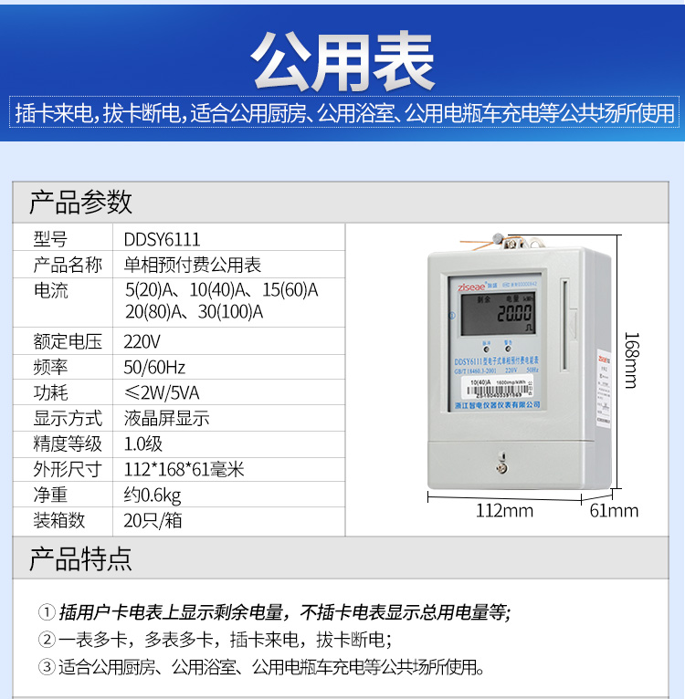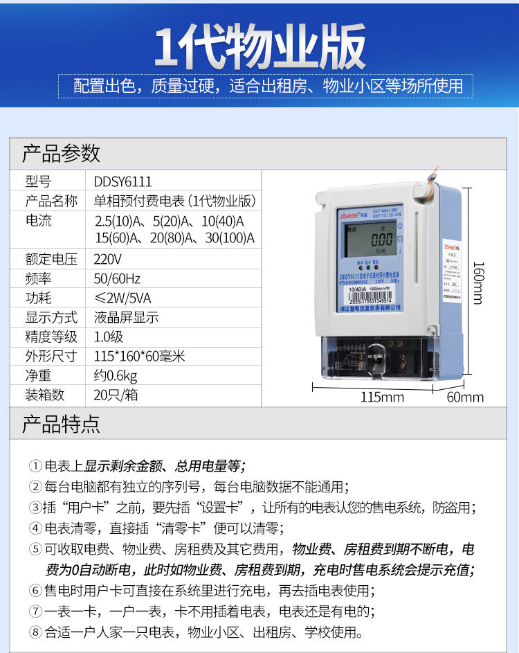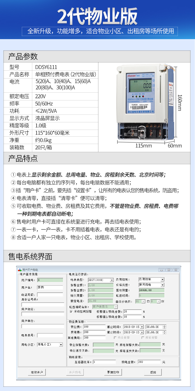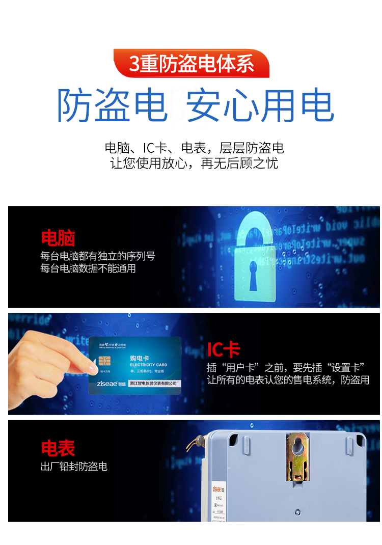 主要特點:應用計算機管理,先購電后用電;在額定電流范圍內能限制使用功率(由供電部門限定);一表一卡,專卡專用,失卡不失電,補卡再用;電卡能雙向傳遞數(shù)據(jù),能自動斷電告警用戶購電;電量為零時,自動拉閘斷電;并具有一定的防竊電軟件設計等。