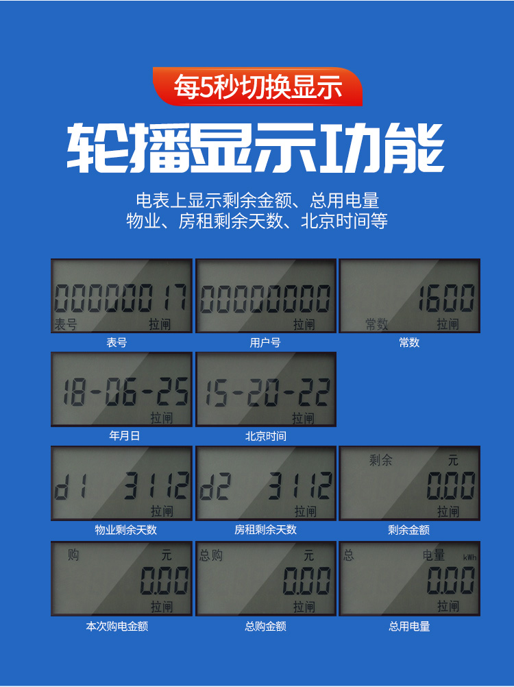 15、 故障申報:剩余電量顯示為零或負值時,顯示“拉閘”提示符,如電表仍繼續(xù)運行,用戶應立即購電,并主動向供電部門反映情況。