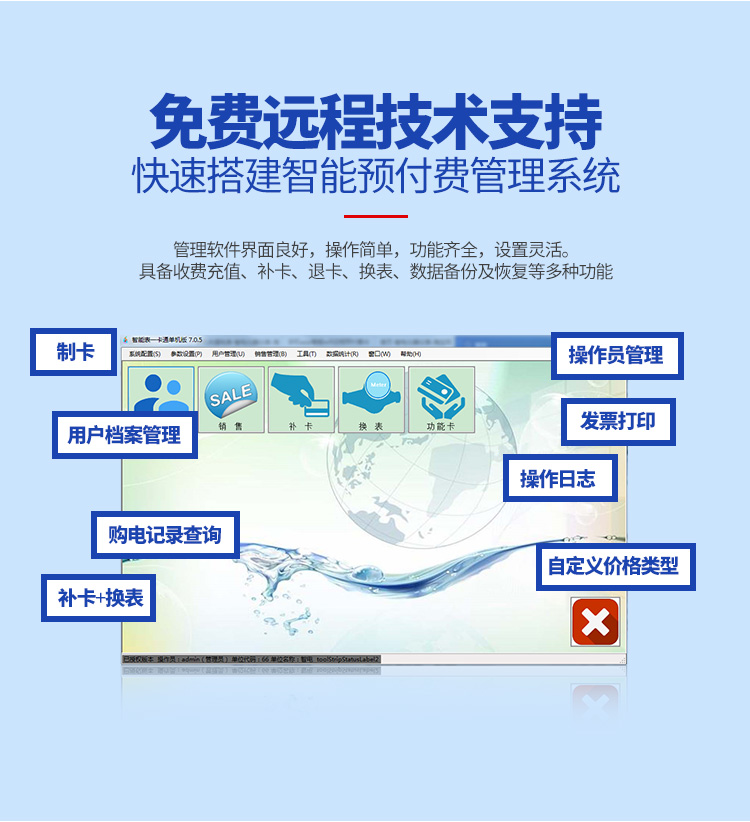 該管理軟件具備收費(fèi)充值、補(bǔ)卡、退卡、換表、數(shù)據(jù)備份及恢復(fù)等多種功能。降低了物業(yè)管理成本,提高了工作效率,減小了勞動強(qiáng)度,水電費(fèi)用提前收繳到位,而且?guī)つ繙?zhǔn)確、清晰。