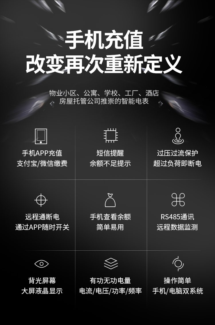 遠程充值電表系統應用小區,寫字樓,工業園,公寓,出租房,工廠,員宿舍,超市,市場,商超等領域,改善現階段物業小區用電管理簡陋,落后,用電管理不僅關系物業的經濟 效益,而且和企業的社會責任密切相關。