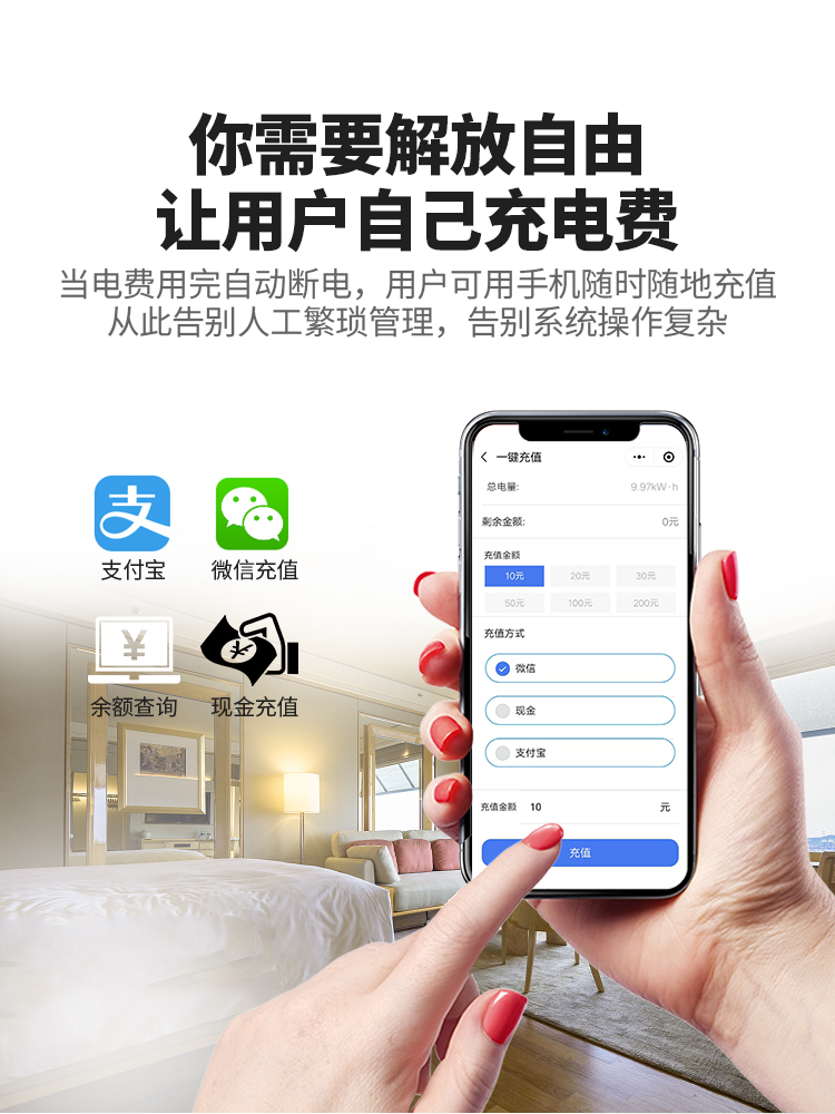 傳統的用電收費方式需要統一抄表,然后回來計算電費,再上門收費。勞動力大,耗時多,收費難,有的業主古意拖欠電費,或上門經常碰到業主。以及后來更為科學一些的插卡式電表也存在諸多缺點:業主的購電卡易丟失,充值需要到物業管理處,需要配備專門的充值電費的管理人員。
